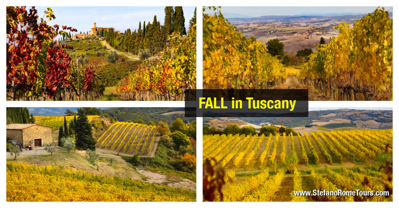 In the fall, leaves on the vines turn vibrant red, warm orange, and vivid yellow for a stunningly beautiful kaleidoscope characteristic of autumn in Tuscany. The vineyards are probably most picturesque in October.